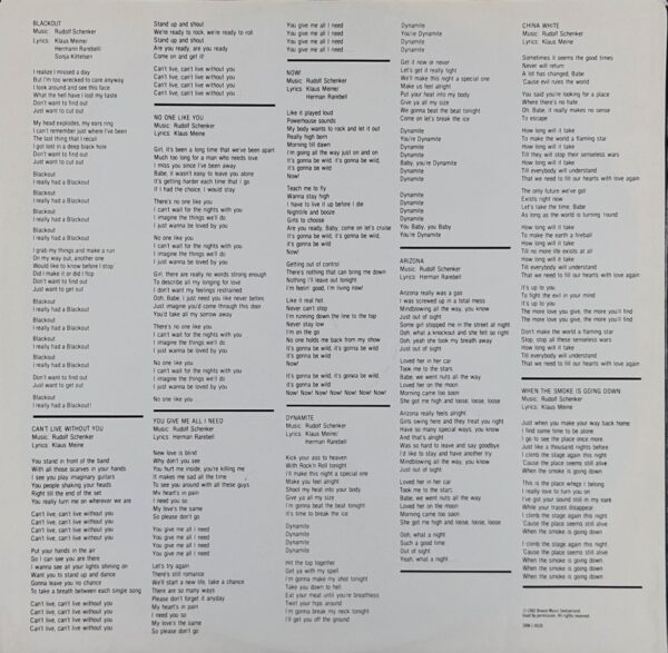 Blackout to przede wszystkim kipiące energią metalowo-rockowe przeboje jak Blackout, Dynamite czy Cant’t Live Without You, które z miejsca stały się koncertowymi killerami. Nie mniej energii ma hit No One Like You, którym podbili Amerykę (choć tu akurat mamy spokojne, niemal balladowe zwrotki) i gnający na złamanie karku Now!. Warto podkreślić, ze rozkręcił się w końcu Matthias Jabs, co słychać zwłaszcza w No One Like You, które stało się jedną z wizytówek pary Jabs/Schenker.Blackout to z pewnością czołówka Scorpions i ścisła klasyka hard rocka. Jeden z tym albumów, które trzeba znać.