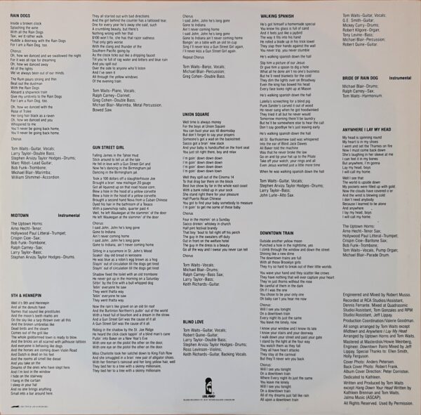 Muzycznie – jest dość typowo dla Waitsa. Korzenny, archetypowy rock, surowy, pierwotny blues, jazz, nowoorleańskie granie, musicalowe ballady Kurta Weilla łączą się w szalony teatr absurdu, obłąkany, groteskowy spektakl. W którym jest miejsce na – na swój sposób oczywiście – chwytliwą, melodyjną piosenkę („Downtown Train” – za parę lat Rod Stewart zrobi z tego przebój), jest miejsce na groteskową polkę („Cemetery Polka”), na nowoorleańskie w klimacie granie („Tango ‘Till They’re Sore”), na elementy gospel („Anywhere I Lay My Head”) czy country („Blind Love”). Ta muzyka jest jak Nowy Jork – w swojej multikulturalności bardzo spójna, wielobarwna, szalona. Jak żadna inna opisuje codzienne losy życiowych wykolejeńców gdzieś wśród nędznych ulic tego innego Wielkiego Jabłka. I jak niewiele innych płyt – potrafi wciągnąć bez reszty.