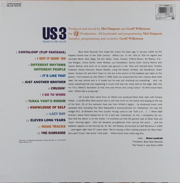 Cała płyta utrzymana jest właśnie w takim kołyszącym, by nie rzec swingowym – i tym samym narazić się jazzowym ortodoksom – rytmie. Stylowe solówki, nawiązujące do utworów wybranych w samplach (a było z czego wybierać – archiwa Blue Note’u stały otworem), rap, nowoczesne brzmienia – mix, który jednak spełnił pokładane w nim nadzieje. Powstała muzyka łatwo przyswajalna, która w jakimś tam stopniu czerpała z jazzu, w o wiele większym z kultury rapowej i dance, która pozwoliła na przywrócenie jeśli nawet nie jazzu, to jego namiastki w miejscach, w których z górą pół wieku wcześniej jazz panował – w salach tanecznych. Jednocześnie zauważalnym był wpływ tej muzyki, na chęć poznawania zsamplowanej (przede wszystkim) muzyki przez osoby, które do chwili usłyszenia Us3 od jazzu raczej stroniły. Rola popularyzatorska „Hand on the torch” jest zatem chyba nie do przecenienia.